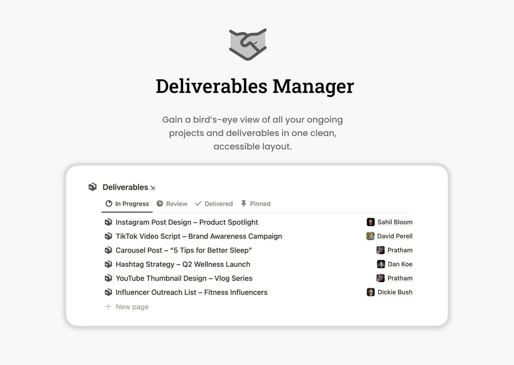 Track your deliverables effortlessly using tools that help you monitor progress, set deadlines, and never miss a beat—no micromanaging required. It’s project clarity without the chaos