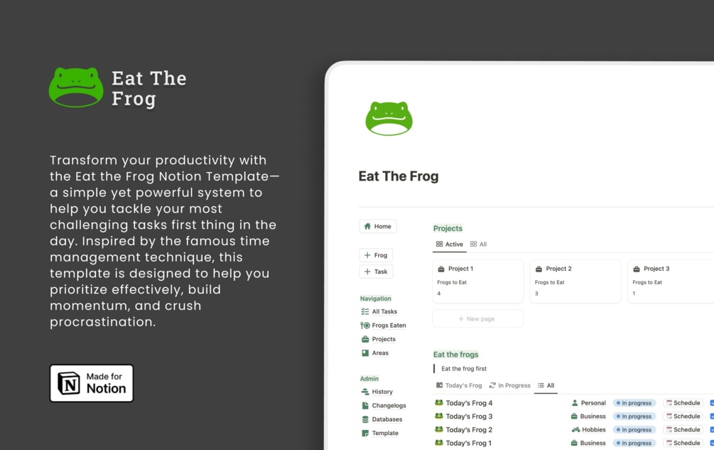 Transform your productivity with the Eat the Frog Notion Template—a simple yet powerful system to help you tackle your most challenging tasks first thing in the day. Inspired by the famous time management technique, this template is designed to help you prioritize effectively, build momentum, and crush procrastination.